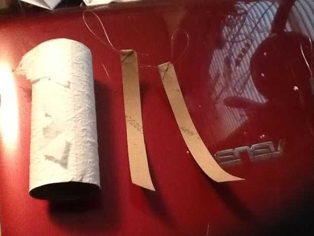 y permite empezar... con cuidado corte el rollo de papel higiénico siguiendo a lo largo de la costura en él hasta su posición horizontal. cortado en espesor deseado de tiras siguiendo el ángulo del rollo desplegado.