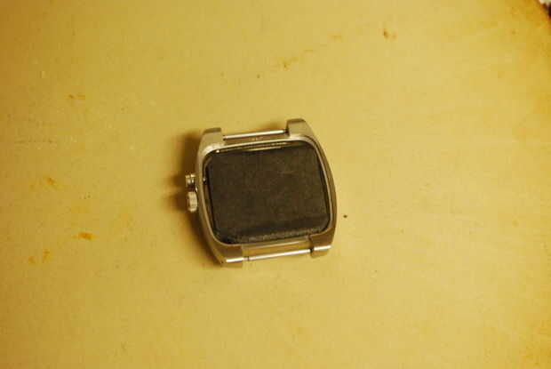 Cortar un trozo de cartón pluma para caber perfectamente dentro de la parte posterior del reloj. No te preocupes corte esquinas perfecto redondeado-sólo cortar un rectángulo y la muesca de las esquinas hasta que el cartón pluma se ajusta a derecho en.