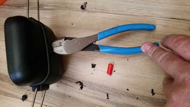 Necesitamos alguna manera de los cables de puente entrar en el compartimento de la batería. Me encontré con una broca del mismo diámetro que los cables que. Perforé dos agujeros adyacentes en la escotilla del compartimiento. Entonces cortado la pieza de plástico entre ellos y suavizadas las cosas un poco con una navaja.
