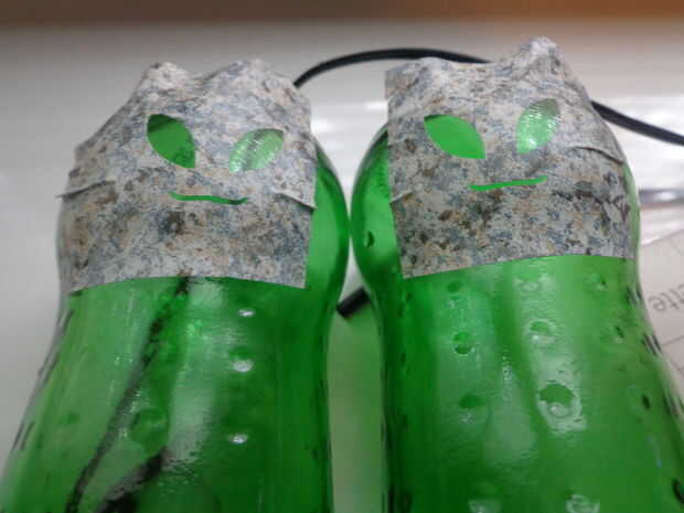 Pegar sus plantillas de cara alienígena en las botellas y presione hacia abajo todo.
