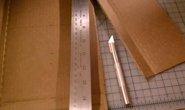 4. Coloque la regla de metal a lo largo de la línea de corte. Usando un cuchillo Xacto encima de una tabla de cortar, cortar a lo largo de la regla, hasta el cartón.