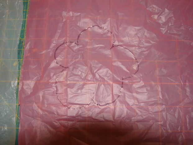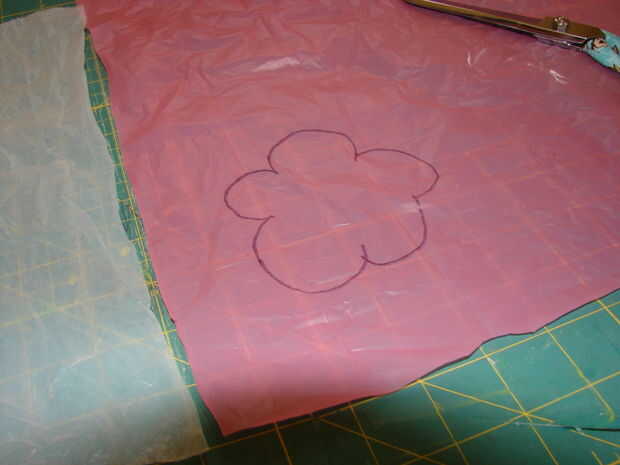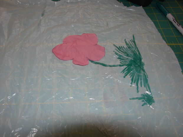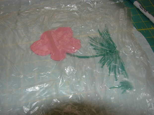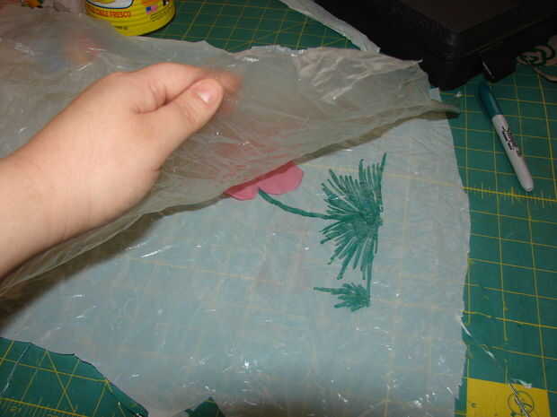 Aquí hay algunas fotos viejas que hice para un babero que se estaba creando para una clase que dio un tiempo atrás. Simplemente tomó piezas de diferentes colores de bolsas de plástico y cortar una flor y se basó en el plástico con un marcador permanente. Salió muy lindo. Ha