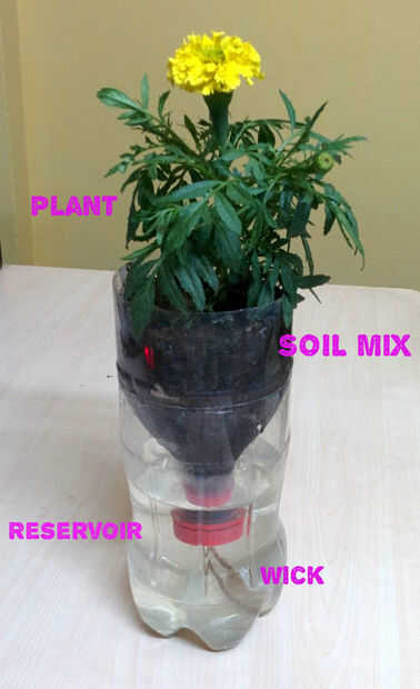 La teoría detrás de auto sistema de riego es simple. Una mecha se ejecuta desde la parte superior de la olla hacia abajo a través de un orificio de drenaje y en un recipiente con agua. Como suelo en la maceta se seca, la acción capilar de la mecha extrae agua el depósito y rehidrata las plantas. Cuando el suelo alcanza la humedad de capacidad de soporte, la mecha para agua dibujo.