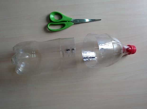 Cortar la botella de refresco con el tijeras y cuchillo siete pulgadas desde la parte inferior.