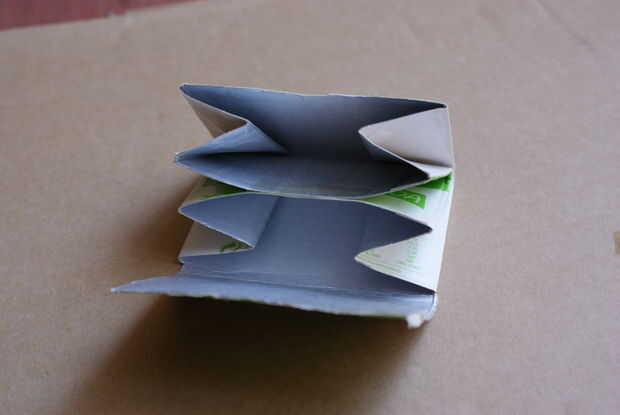 Ahora puede doblar en tres partes y utilizar la cinta o grapadora para fijar la parte central, esto es el cuerpo de su cartera, y la buena imagen es el frente.