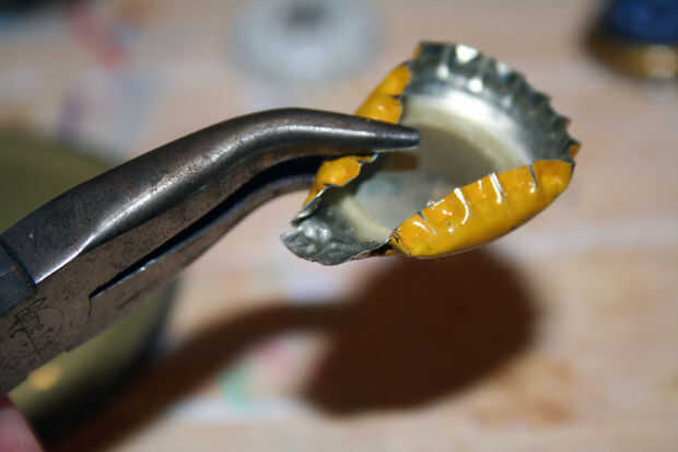 empecé a doblar mis tapas de botellas en forma de pétalos de flores. La idea básica fue inspirada por un anterior proyecto que yo había creado una flor de fieltro . Usé mis alicates y empezamos a doblar hasta que me dieron la forma que quería. Para mí, la forma más sencilla de hacerlo era agarrar el borde de la tapa y tire hacia abajo para aplanarla. Luego que se doblaría en los dos lados. Por último, doblarían hacia abajo la parte superior. Mi primera pocos pétalos parecían gotas de metal por lo que toma un poco ensayo y error.
