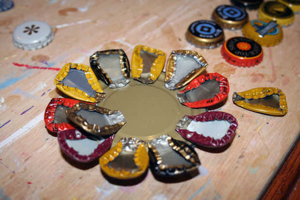 Como fui, puse mis pétalos hacia fuera en la tapa de la lata para determinar cuantas necesitaría. Hice dos capas de pétalos, pero usted puede cambiar para arriba y hacer más si quieres.  A continuación que pegué en los pétalos. Hice toda la fila exterior primero y luego pasó a la segunda capa. Como he mencionado antes, he intentado usar pegamento pero encontró que algunos de mis pétalos no celebración por lo que cambié para epoxy.