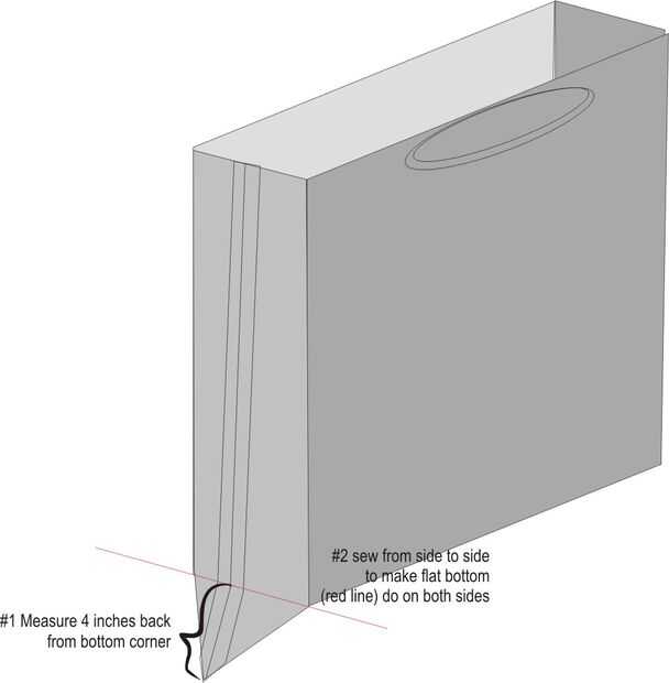 Aquí está una manera fácil de hacer una bolsa de fondo plano; sin embargo amplia que desee la parte medida en la mitad de la parte inferior de la esquina y trace una línea a través de y cosa en esa línea, para ambas esquinas de la bolsa.