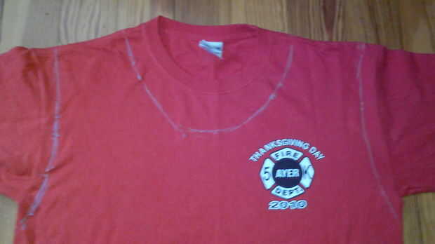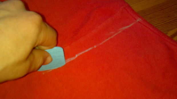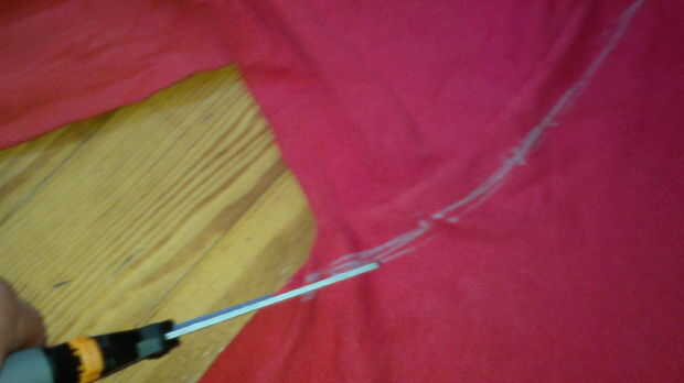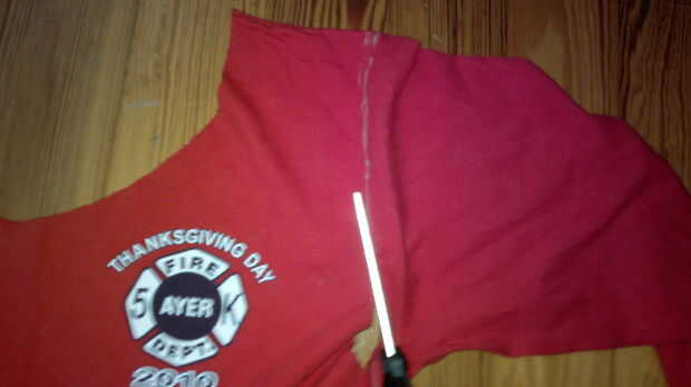 A continuación usted querrá cortar la zona del cuello. Desea que el área del hombro a unos 2-3 pulgadas de ancho a cada lado. No corte demasiado baja o tu bolso será pequeño (a menos que lo que vas, en cuyo caso usted puede querer hacer los cortes de manga más profundo). Si hay un logotipo, puede intentar ajustar el corte, pero hacen tan simétrica como sea posible. Recuerde que es muy fácil de cortar más apagado, pero no tan fácil de añadir más.