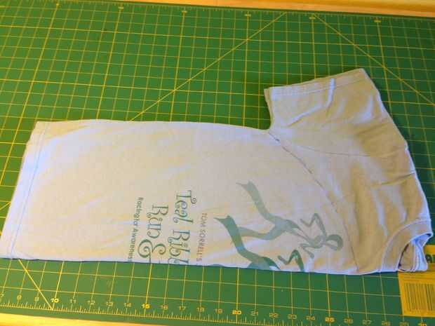 1. con el lado derecho de la camisa (con palabras), doblar la camisa por la mitad longitudinalmente.