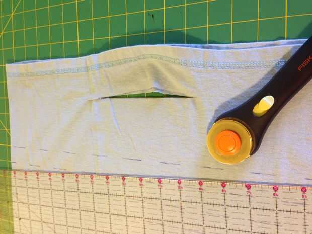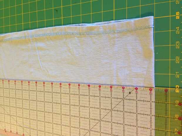 Tirón de la camisa alrededor de modo que el dobladillo en la parte superior y mida unos 2-2.5 pulgadas abajo desde el borde para cortar una larga para la manija. Mi cortado cerca de 6 pulgadas en el primero (en esta foto), pero luego decidió que le gustaría poder llevar en mi hombro, por lo que alarga el corte a cerca de 14 pulgadas. Usted puede cortar el mango para ser tan largos o cortos como desee.