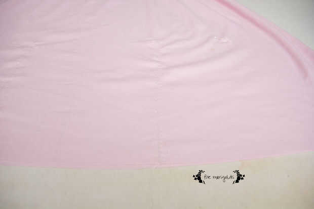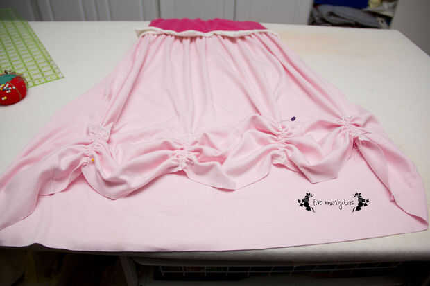 Bullicio la falda por coser dos 9" paralelo largo y flojo de puntos sobre cada 6" alrededor de la base del vestido. Sujeción de la parte superior e inferior de cada conjunto de líneas de hilo con un alfiler, tire suavemente de ambos hilos para el tejido a la longitud deseada de la colmena. Una vez has volantes todas las secciones, coloque la tela estabilizadora debajo y coser sobre la parte superior. Quitar los hilos blando largo originales, y su vestido es completo.