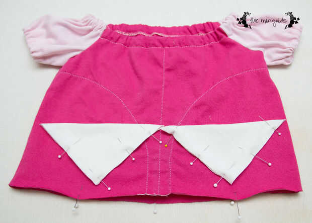 Ahora, embellecer su vestido sin embargo usted elige! Yo iba para un vestido de la bella durmiente, así que cosió un collar simple y tachuelas a lo largo del cuello (para permitir el movimiento de costura un pedacito pequeño cada varias pulgadas). Luego dobla 5 x 5" cuadrados de tela en triángulos y tachuelas alrededor de la cintura.