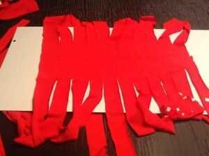 Volver a la corona... para hacer una tira continua, dejar las costuras laterales Unidas y cortar la camiseta en tiras de una pulgada o una pulgada y media amplia, teniendo cuidado de dejar cortar aproximadamente dos pulgadas de una de las costuras laterales como en la segunda foto. Abre la camiseta y meter algo en el medio por lo que se puede ver claramente y no cortar a través. Me resbalé en un pedazo de cartón, que es el cuadrado blanco que ves en las fotos.