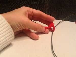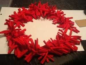 Así que ahora que tienes un montón de piezas cortas, tomar su percha y lo doble para que sea un círculo. Atar los trozos en uno a la vez, usando un solo nudo. Continuar hasta que termine la suspensión de capa entera. Créalo o no, sólo tomó una camiseta!