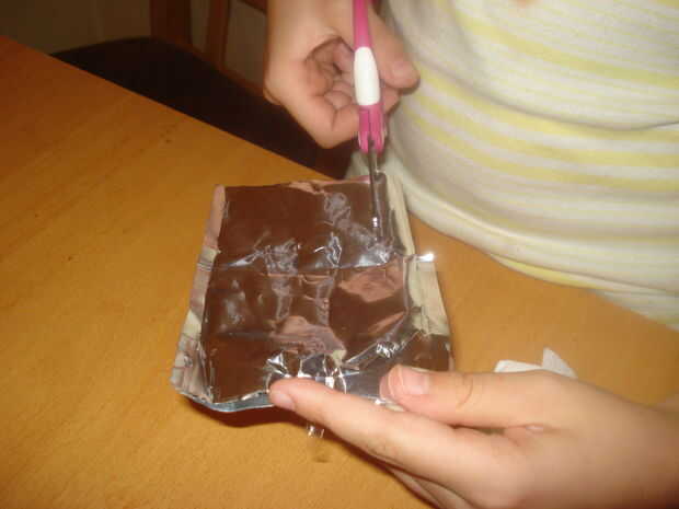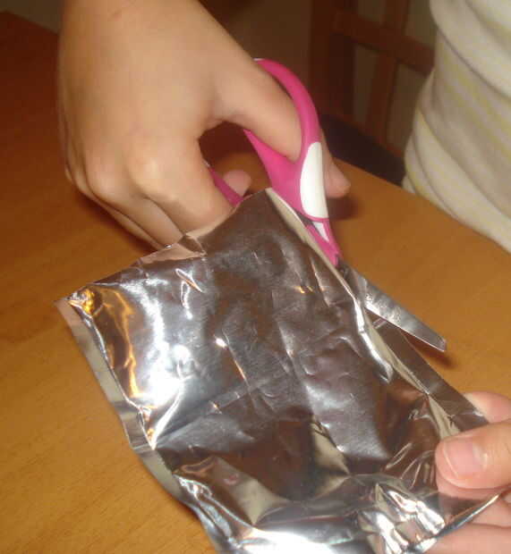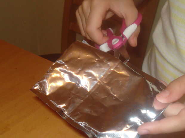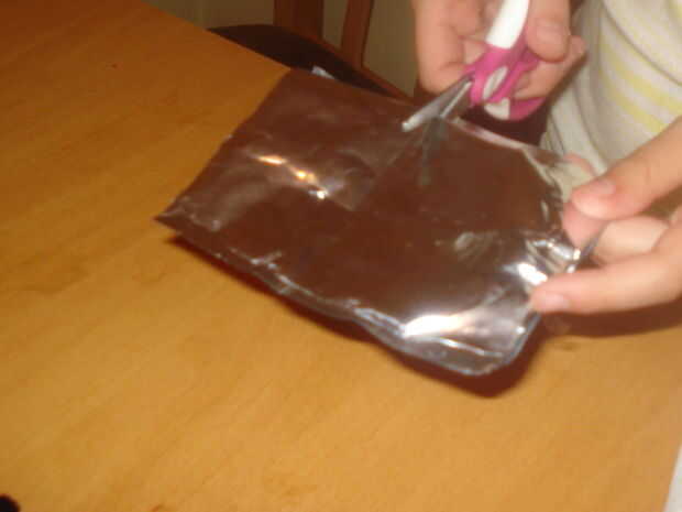 A partir del borde de corte superior, corte los lados para que la bolsa de la izquierda se pueda deslizar dentro de la bolsa a la derecha.