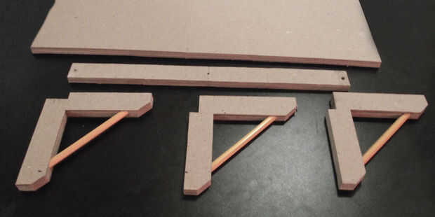 Pegamento hasta 1"(25mm) ancho espalda soporte como se muestra en la imagen. Dejar secar y recortar todas el piezas cuadrado. Las esquinas exteriores de los soportes para encajar el soporte posterior de la muesca. Pegue y atornille el soporte posterior a los soportes.