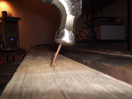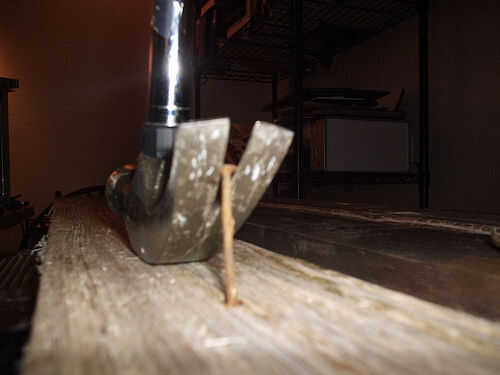 Martillo de los puntos de los clavos lo suficiente hasta que la cabeza es lo suficientemente alta como en el otro lado para extraer el clavo.  Desenroscar los tornillos si es posible.