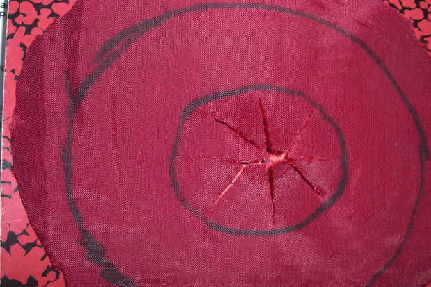 Luego corte su terciopelo en formas de pastel en el centro y aberturas alrededor de los lados para que la tela se doblan sobre los bordes de la cartulina y pegamento abajo fácilmente.
