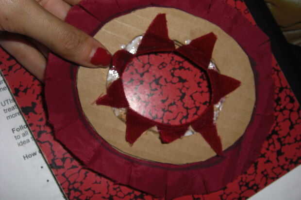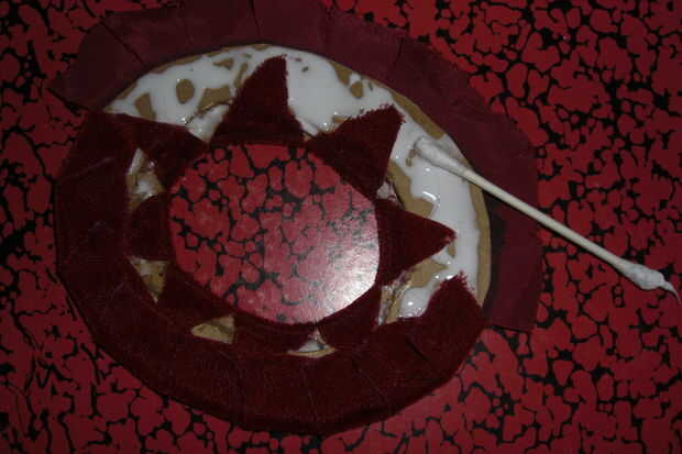 Dar unos minutos para secar en este punto, pero no lo suficiente donde se pone difícil, la longitud que se necesita para tomar una taza de té funciona bien, luego poner una capa delgada de pegamento en la parte superior del terciopelo alrededor del borde interior y fijar el plástico en el centro, empujando hacia arriba a través del centro por lo que se pega hacia fuera , y viendo que no tiene los bordes del centro de la extraña mirada de marco, si llegan a empujar hacia abajo al ras.