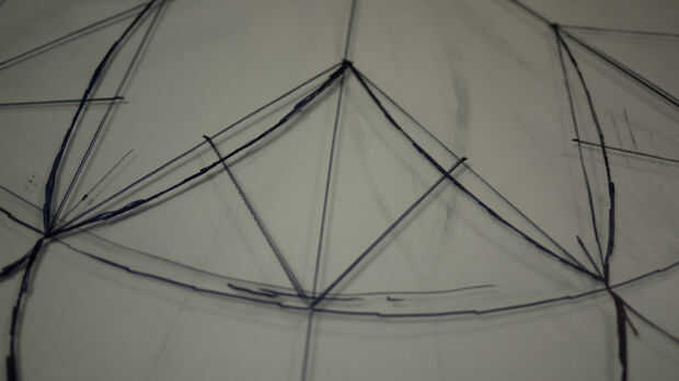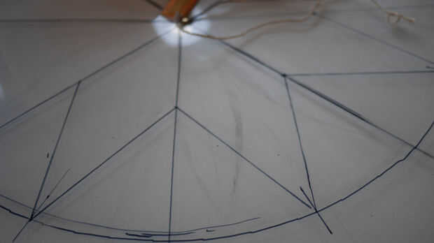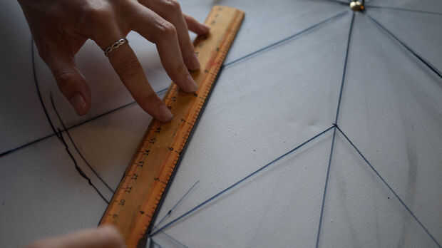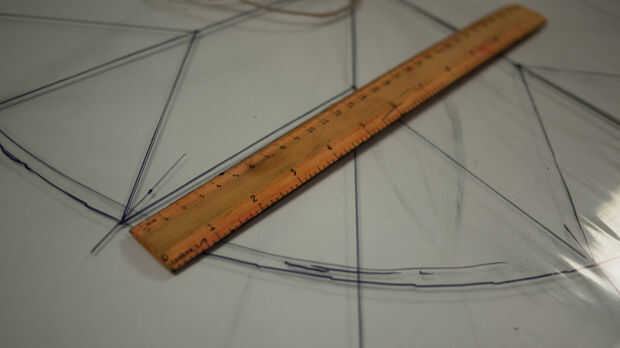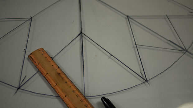 Trazar una línea desde la marca en el medio de las líneas del círculo externo a cada punto en el centro de las líneas de base. Esto le dará su primer patrón de la flor.