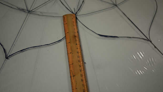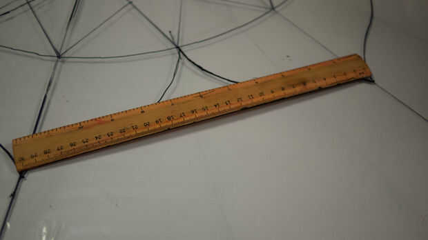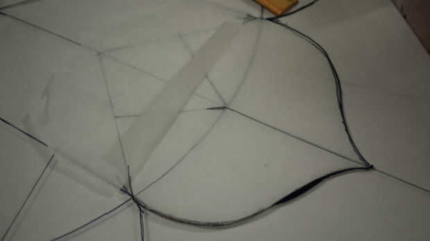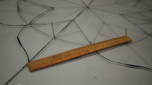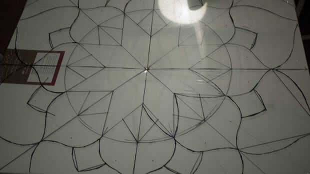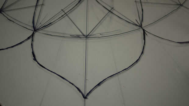 Quería que la punta de mis pétalos de templo para tocar la parte inferior y superior de mi lienzo, había medida desde el borde del círculo hasta la parte inferior de mi lienzo y utiliza esa longitud para determinar el resto de las longitudes de pétalo de templo. Puede simplemente llamar un punto para cada punta del templo, o dibujar la línea completa para mostrar la distancia entre las líneas de pétalos pequeños y donde están sus extremidades del templo.