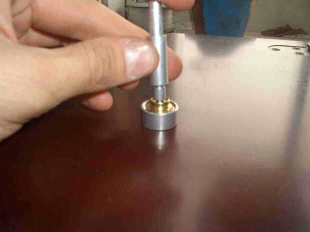Para fijar broches de presión, se haga un orificio a través de los materiales a unir y el post de presión a través del agujero de la inserción. Coloque la parte superior del complemento en la encima del poste y poner todo en el lado correcto del yunque como se muestra en 3 y 5. Coloque la herramienta de ajuste en la parte superior del poste con los appliqués abajo y centrado. Golpear el yunque con el martillo como sea necesario hasta que el complemento es seguro.