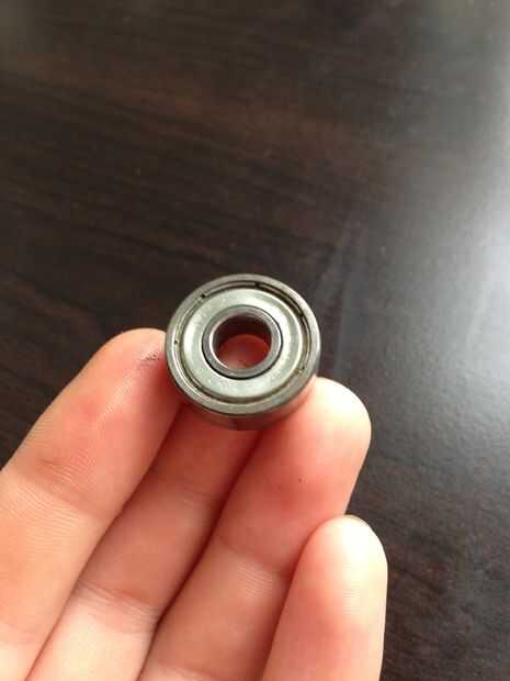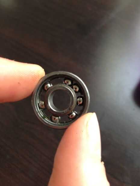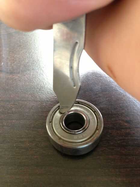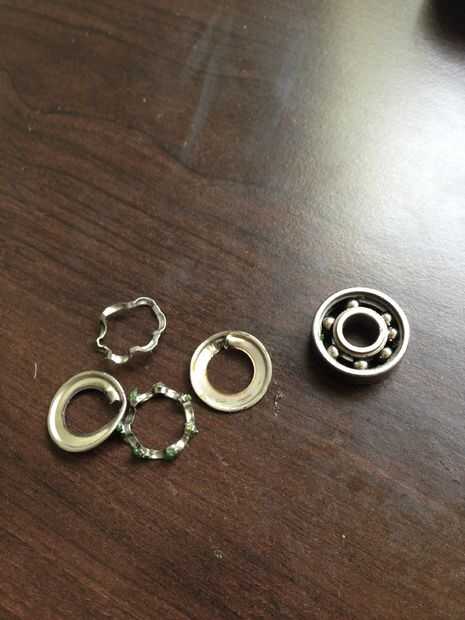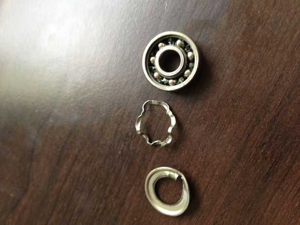 Rodamientos están hechos para no desarmarse a propósito por lo tanto hay forma especial para hacerlo. Tomar el cojinete y fijar sobre una superficie plana. Utilice la herramienta pinchar para hacer un pequeño agujero en la tapa de la bola de metal. Levante la tapa con las pinzas y extraerlo. Luego hay una pieza de metal ondulada que se utiliza para espaciar las bolas, eliminar con la herramienta de punción (que en mi caso era una lima de uñas de metal multi herramienta). Repita en el otro lado. Ahora lo único que queda es las bolas y el anillo interno y externo. Mueva todas las bolas a un lado del anillo y luego aplique presión a través de los dedos hacia el lado opuesto de las bolas. Pop a cabo y la izquierda con el anillo externo real.
