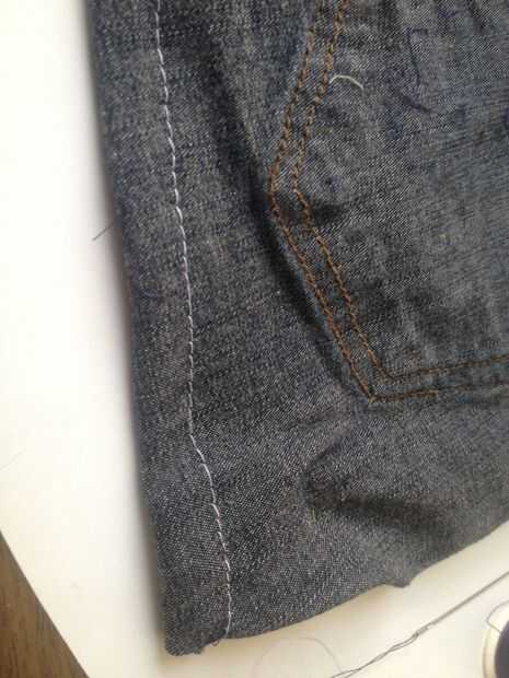 1. puntada de la máquina de un lado de la bolsa directamente a través al otro lado. Si tienes problemas de cosido sobre las costuras de la entrepierna, levantar el pie prensatelas y girar manualmente el volante hasta llegar al otro lado de la costura.