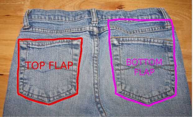 Vea el diagrama de cómo cortar. La solapa superior (contorneada en color rojo) se corta justo en el bolsillo, la solapa inferior (indicada en rosa) se corta en la parte inferior y los lados pero le dan más material en la parte superior para sujetar la tapa a la parte inferior.