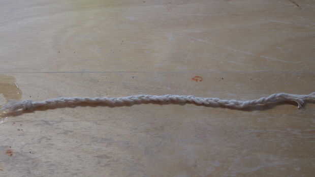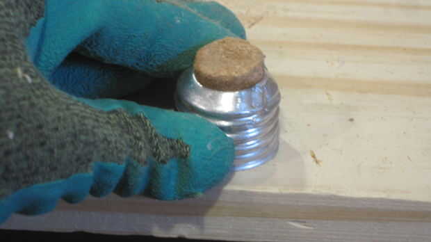 Ahora que tienes una bombilla vacía, necesitarás algo para tapar encima de la parte superior y mantener en la mecha. Decidí usar un corcho. Lamentablemente, sólo tenía un corcho del vino, así que algún corte y lijado se requería. Después de su enchufe, utilice un clavo o algo similar para poner un agujero a través de él. Este agujero tendrá su mecha. La mecha se puede hacer prácticamente nada de algodón. Para mi mecha, juntos había trenzada un hilo de cocina, pero se puede utilizar para tiras de bolas de algodón de una camiseta de algodón. Si salió de su base metálica, encajarla con pegamento caliente o pegamento. También puede utilizar el pegamento rellene cualquier grieta en la bombilla.