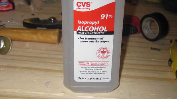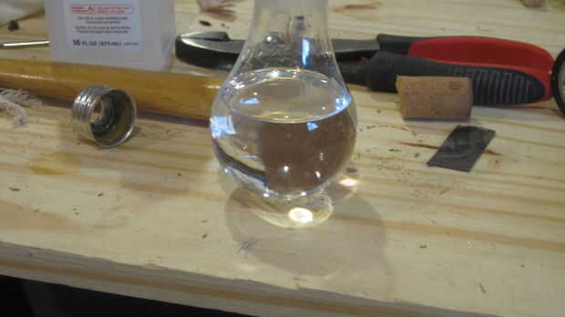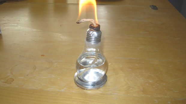 Ahora que tu lámpara listo, rellenar con combustible. Alcohol isopropílico funciona bien. Si utilizas alcohol, asegúrese de que es al menos el 90%. El problema con el alcohol es que no producen luz, solo calor. Si lo desea, también puede usar aceite. Aceite de oliva normal debería funcionar. Saque la mecha por el agujero de enchufe y el enchufe en la lámpara. Ahora tienes que esperar para que su mecha absorber el combustible. Espere hasta que la mecha toda está mojada. Cometí el error de ser impaciente y tratando de tomar la punta de la mecha. Acabé consiguiendo alcohol sobre el corcho, por lo que cuando encendí la lámpara, el corcho se incendió. Incluso si no lo hace, todavía podía coger el corcho. Si esto sucede, dejan solo quemar un poco y se detiene. Asegúrese de utilizar un centímetro a un centímetro y medio de mecha.