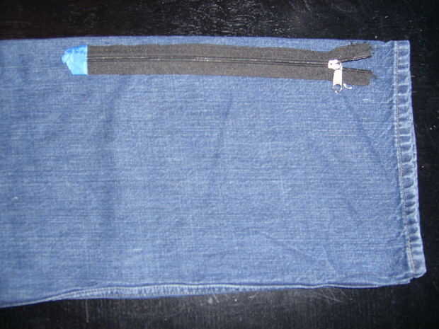 Corte en la pierna de los pantalones vaqueros de cerca de 1 pulgada más ancha que la cremallera.