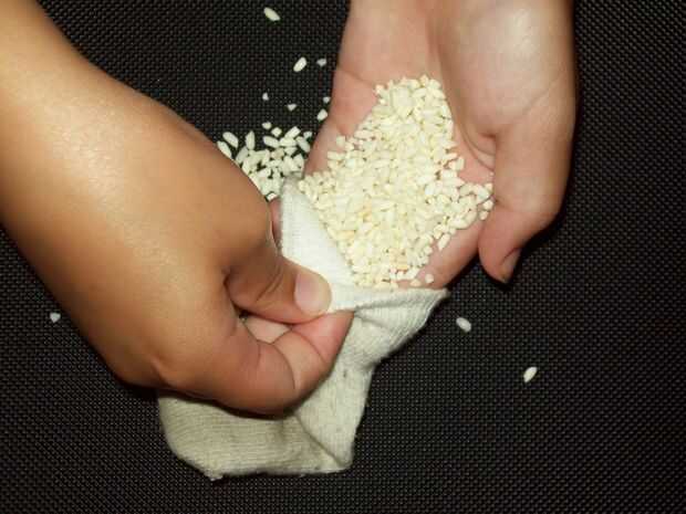 Inicio rellenando uno calcetín hasta que tenga una buena forma de salchicha pequeña. Ayuda a dejar una pequeña habitación vacía, por lo que se puede doblar una aleta pequeña, para mantener el arroz para el siguiente paso.