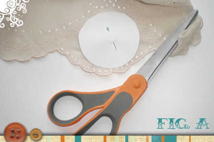 Tome el pedazo de papel y haga un círculo de 2.5" de diámetro, cortar este círculo como un patrón. Corte 30 círculos usando a la tela de su elección (fig. A).