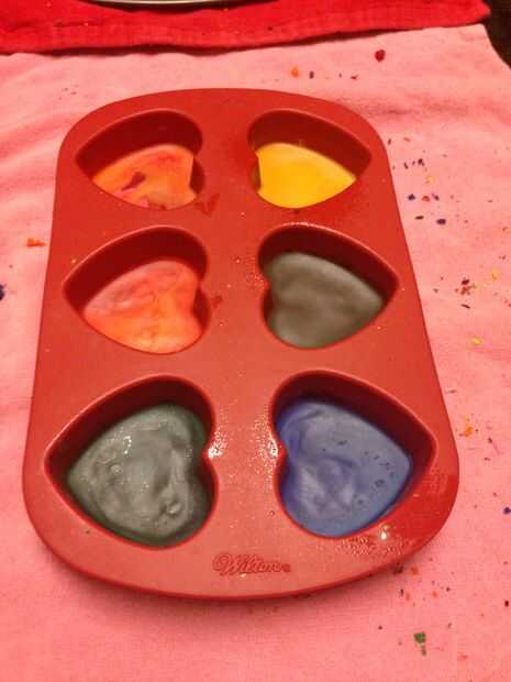 6) deje que endurezcan tus crayones para al menos una hora. Dejamos nuestros lápices de colores para endurecer durante la noche. Si estuviera en un apuro puedes pop en el congelador, sólo asegúrese de que los moldes son en una superficie nivelada. Limpieza también una brisa - sólo corre agua caliente sobre los moldes y limpie los pedacitos de crayón derretido.