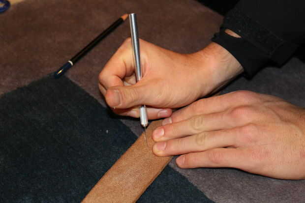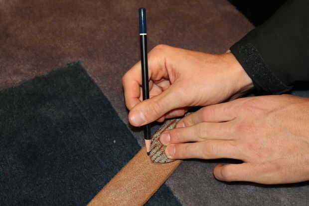 5.Take su herramienta de marcaje, utilicé un lápiz y trace una línea alrededor del extremo de la correa que le da una guía de corte. Esto no tiene que ser exactamente perfecto como después haces el corte inicial se pueden recortar hasta sus estándares exigentes, o al menos las normas de que alguna vez fue que hizo el corte del extremo de la correa original. Si no eres un fan de ese corte que puede cortarse ambos extremos y obtener la forma desea tan desesperadamente.