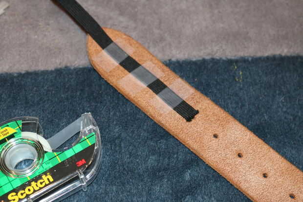 En este paso que se trata de no colocar la correa pero sólo fijar en su lugar para que puede emparedado entre el cuero y fijar cosiendo a través de él. Personalmente usé sólo una poco la cinta scotch para ello pero podría utilizar un lenguado o dos de pegamento si es más su estilo, sólo asegúrese de dejarla secar antes de pasar al siguiente paso.