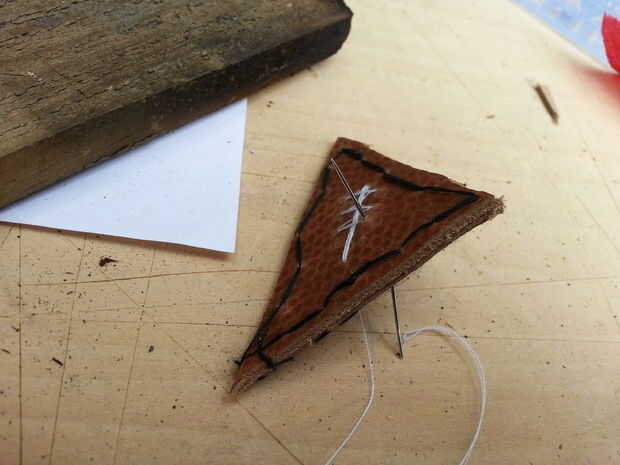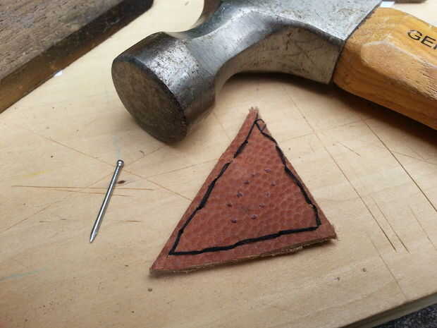 Para este paso usé un clavo para crear un agujero y una aguja para enhebrar la cuerda. Al clavar las piezas utilizar una pinza para mantenerlos juntos así que los agujeros no cambiar. A continuación utilizar cadena negro para roscar los agujeros exteriores. Para los cordones de la fútbol, clavo diez puntos como la foto de arriba muestra. Ahora hilo cuerda blanca a través de agujeros similares a antes. Una máquina de coser puede usarse para simplificar este proceso.