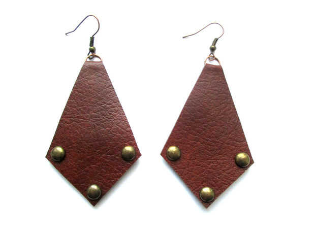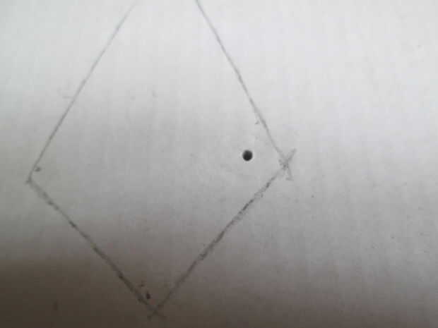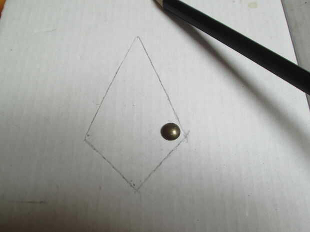 Para estas he usado tachuelas y un método sencillo cómo solucionar en cuero. Pero primero tomar un trozo de cardboad y dibujar la forma. Clave una tachuela en la esquina y retirarlo. Ahora puede ver un agujero, que te ayudará a saber qué distancia de los bordes que te necesita.