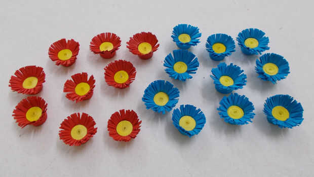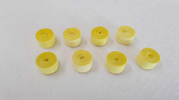 Hacer bobinas apretadas coloreadas amarillo y envuelva las rojo y azul alrededor de las bobinas firmemente amarillo.