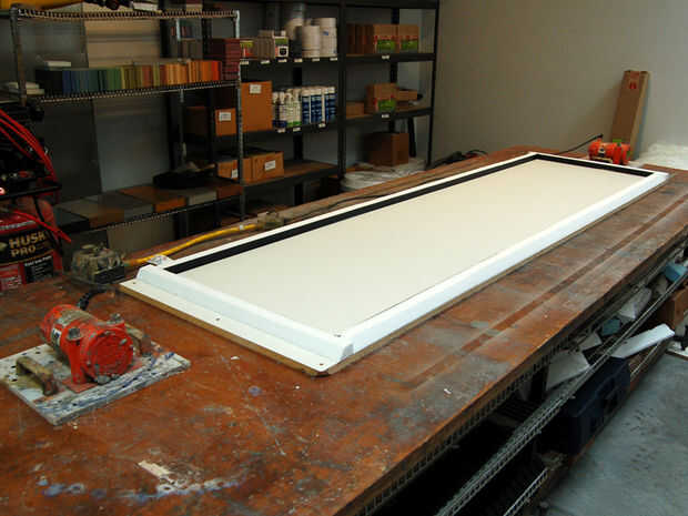 - Para esta encimera de cristal de 24 "x 91" reciclado cortamos la forma de melamina de 3/4 base de 28 "x 95". Esto permite 2" a cada lado (4" total) para la adaptación a las paredes de forma de espuma.