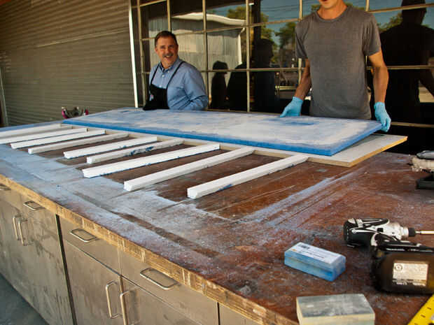 - Antes los bancos la parte superior, derribar los bordes irregulares en el hormigón con pads de diamante mano. Esto minimizará el romper con almádena y crear una superficie lisa al ejecutar su mano a lo largo de la parte inferior de la sección de la encimera.