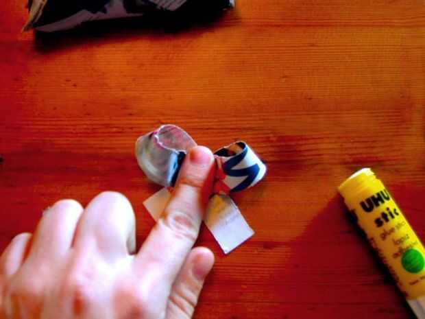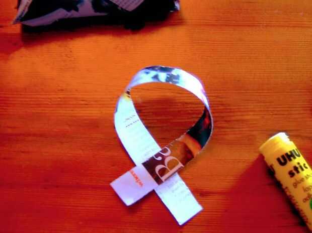 Hacer un lazo y pegar al final juntos dejando una pulgada de ambos extremos.