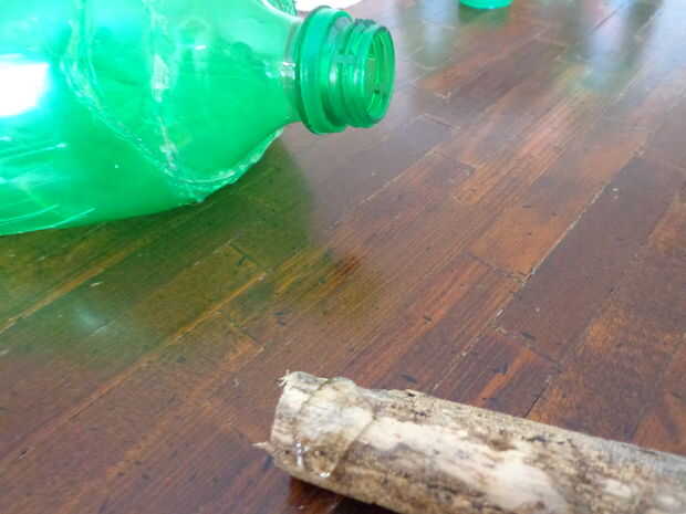 Tomar un palo que se ve "witchy" y puede caber un extremo cómodamente dentro del cuello de la Mtn Dew (mina encontré en el patio de mi casa, pero una varilla de pasador que cabe en el cuello de la botella podría funcionar también).