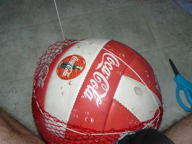 Rellene su bola dentro de la red. Una vez en, tomar una longitud de 36 pulgadas de cuerda y atarla a la parte superior de la red. Tejido dentro y fuera de la parte superior de la red cada pocas pulgadas. Una vez que se rosca la cadena completamente alrededor de la red, pasar por encima de la bola e hilo debajo de la cadena en el lado opuesto de la pelota. Eso es todo, ahora llevar la bola por la cadena o lazo en su bicicleta, silla de paseo, mochila o coche.
