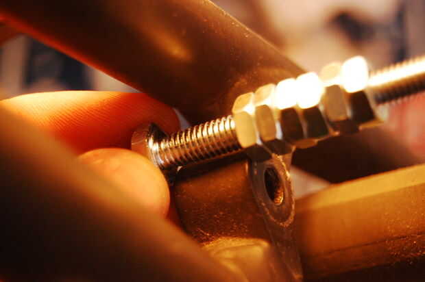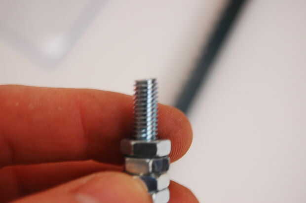 Poner las 6 tuercas del perno M6 asegurándose de que las tuercas de descansan uno contra el otro, pero no demasiado como usted quiere ser capaz de aflojar el perno fácilmente más tarde por. A continuación compruebe que la separación de la cabeza del tornillo y las tuercas tiene el mismo ancho de su puente de freno. Si tienes exceso perno en el extremo, usted necesitará cortar sosteniendo el perno en un vicio o algún otro método.