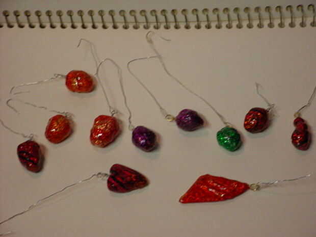 Aquí algunas de las piezas acabadas, es como se pueden ver sus formas no limitadas a redonda/ovalada, la forma del corazón utiliza 2small y una bola de tamaño mediano y trabajó en forma como yo les cubrió, el diamante? forma era un pedazo de la caja de jugo cortado a la forma, cubierta con papel de aluminio y un par desechos de alambre superglued en entonces cubierto con el papel de color