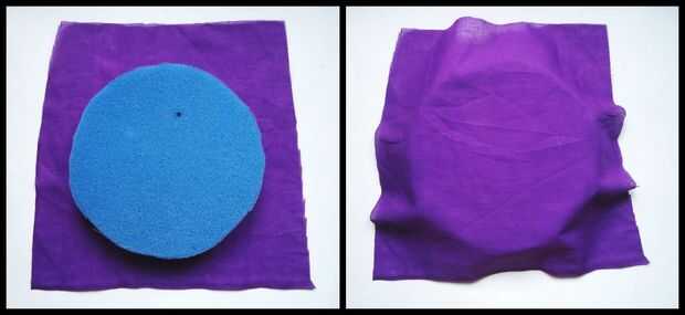 Tome un pedazo de tela un poco más grande que la tapa. . Luego cubra la tapa con la tela (sobre la esponja).