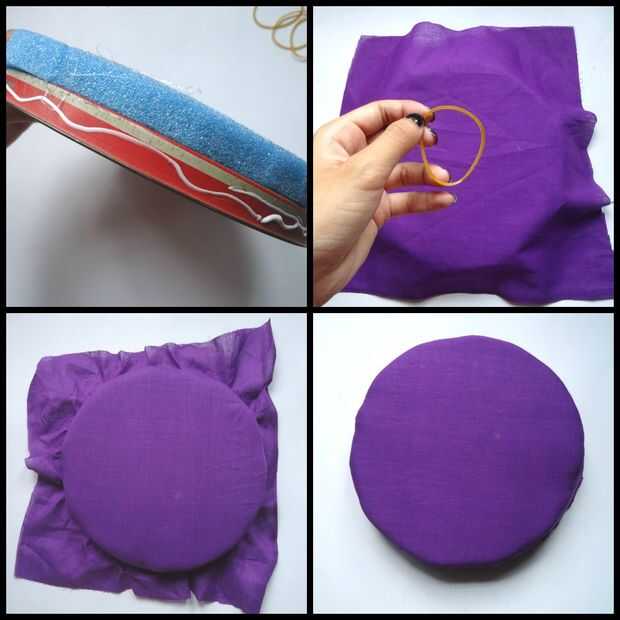 Aplica pegamento alrededor de la tapa. Tome la banda elástica. Se extienden alrededor de la tapa con tela para sujetar a la tela. Corte los extras.